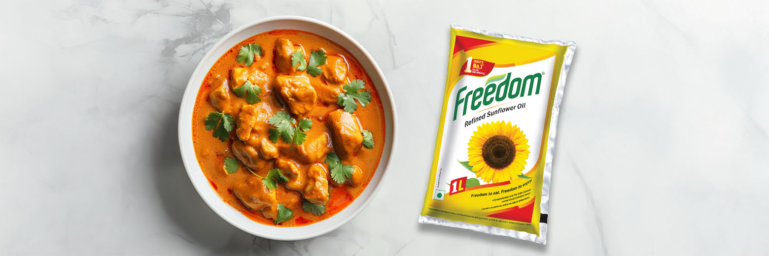 Heat Freedom Refined Sunflower Oil in a kadhai or pan with butter/ When butter melts add ginger garlic paste and sauté. Then add pureed mixture and bring it to a boil, tip in haldi, coriander powder, jeera powder, black pepper powder, garam masala and kasoorimethi powder. Add half cup of water and let it simmer for some time.Now add cooked chicken pieces. Adjust salt if required and add honey. Cook for some time. If you feel that gravy is becoming thick then add little milk/water. Once it is done add fresh cream, stir and remove from flame. Garnish with dash of cream and serve with the bread of your choice.