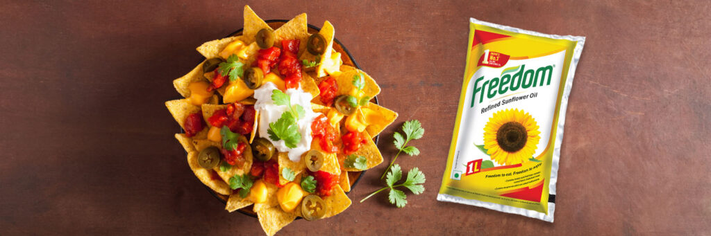 Divide the dough into 3 equal portions.Roll each portion using a little plain flour for rolling and prick it evenly with a fork.Cut into 1.5” – 2” strips and then cut equal triangles and keep aside.Heat the Freedom Refined Sunflower Oilin a deep kadhai/pan and deep-fry, a few chips at a time, on a medium flame till they turn crisp and golden brown in colour from both the sides. Drain on an absorbent paper.Repeat steps and make chips in batches.Cool and store in an air-tight container.