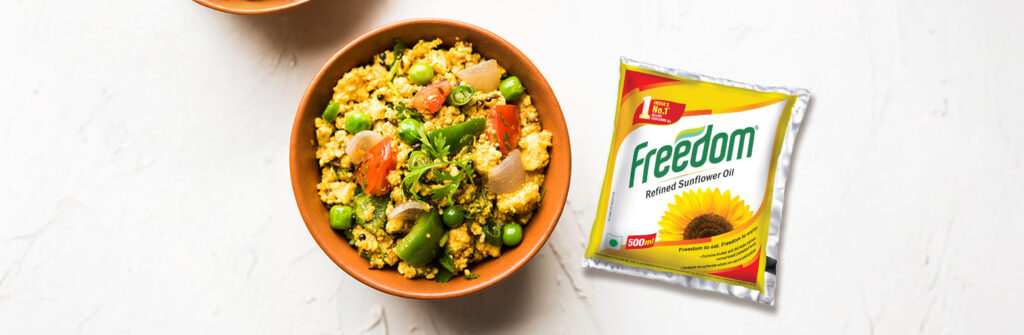 Paneer Bhurji is a delicious, protein-packed Indian dish made with crumbled paneer cooked in a vibrant blend of onions, tomatoes, capsicum, and aromatic spices. A light sauté in Freedom Sunflower Oil enhances the flavours, giving the masala a wholesome, heart-healthy base while keeping the dish light and tasty. This quick and flavourful paneer bhurji recipe is perfect for breakfast, lunch, or dinner, offering a balanced mix of richness and spice. The soft crumbled paneer absorbs the masala beautifully, creating a creamy texture complemented by fresh coriander, green chillies, and a squeeze of lemon. Paneer Bhurji pairs wonderfully with roti, paratha, pav, or even as a stuffing for wraps and sandwiches. Loved for its simplicity and versatility, it’s a go-to dish for busy days when you want something nutritious, comforting, and ready in minutes. Whether you’re a paneer lover or seeking high-protein vegetarian meals, Paneer Bhurji never disappoints.