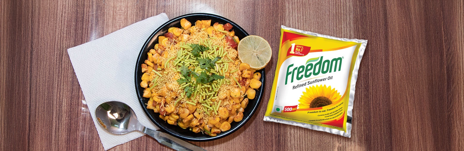 Corn Bhel is a vibrant, flavour-packed chaat that blends sweet corn with the irresistible crunch and tang of classic Indian street snacks. This refreshing appetiser is made by tossing steamed sweet corn kernels with onions, tomatoes, green chillies, coriander, and a squeeze of fresh lemon juice. A light drizzle of Freedom Sunflower Oil enhances the flavours, helping the spices coat the corn evenly while keeping the dish heart-healthy and delicious. Chaat masala, tamarind chutney, and green chutney give it the perfect sweet, spicy, and tangy balance. Finished with sev or crushed papdis for crunch, this is a colourful, wholesome, and quick snack that’s perfect for evenings, parties, or guilt-free cravings. Both kids and adults love its refreshing taste and vibrant texture.
